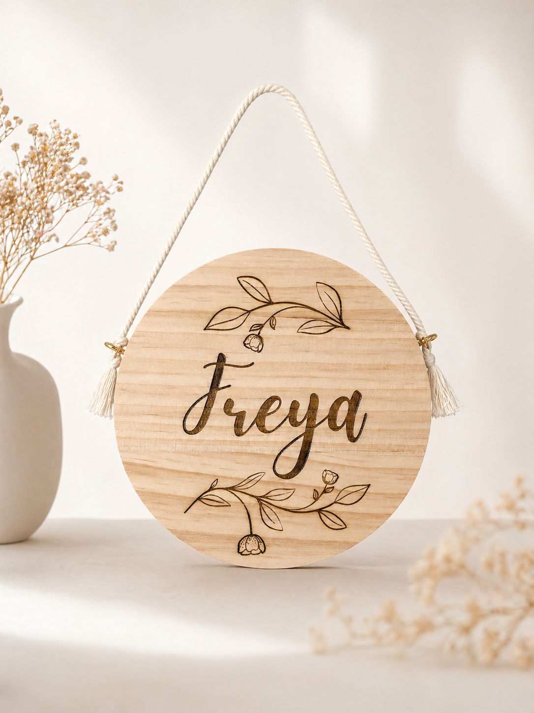 Cartel personalizado con el nombre del bebé, adornos florales y tiernos flecos con detalles en dorado.